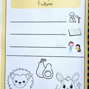 - Word & Coloring Page: Three Islamic words for each letter, plus a small coloring section with objects that start with that letter.